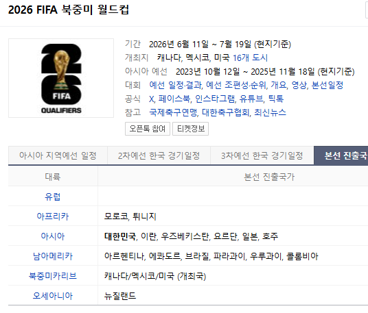 2026년 월드컵은 미국, 캐나다, 멕시코 3개국이 공동 개최하며, 본선 참가국은 48개 팀으로 확대됩니다. 조추첨 방식은 다음과 같습니다.