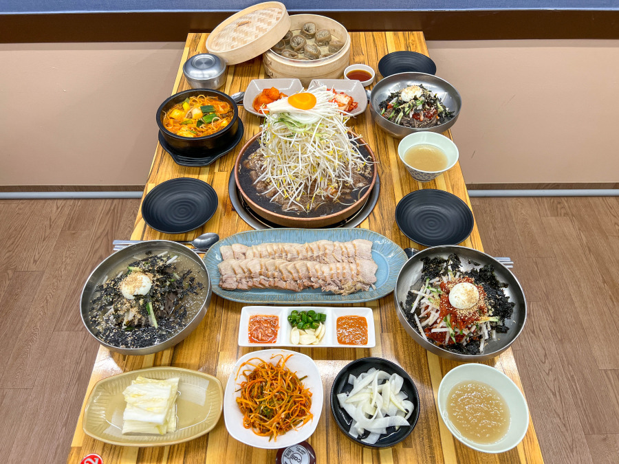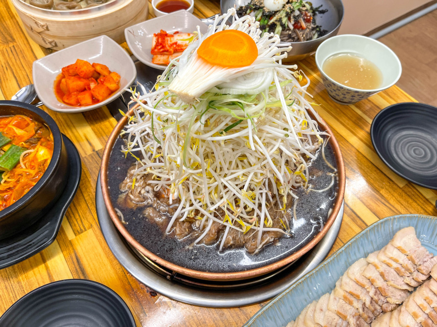 중앙의 소고기와 숙주, 파채가 어우러진 메인 요리를 중심으로, 김치, 깍두기, 된장국, 수육, 국물, 비빔밥 등 다양한 반찬들이 조화롭게 놓여 있어 정성과 따뜻함이 담긴 식탁 사진에서 느껴지는 분위기는 세가지로 정의해볼수 있는데요
